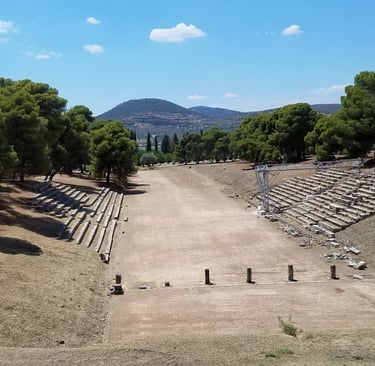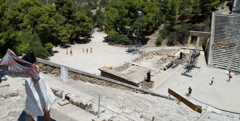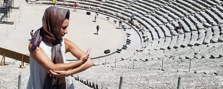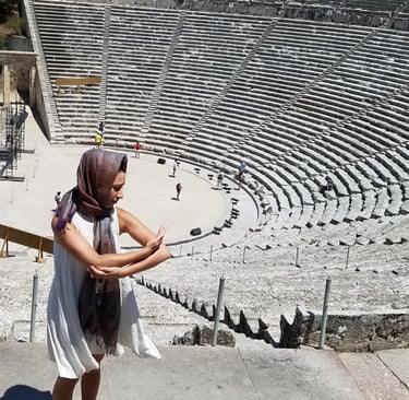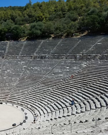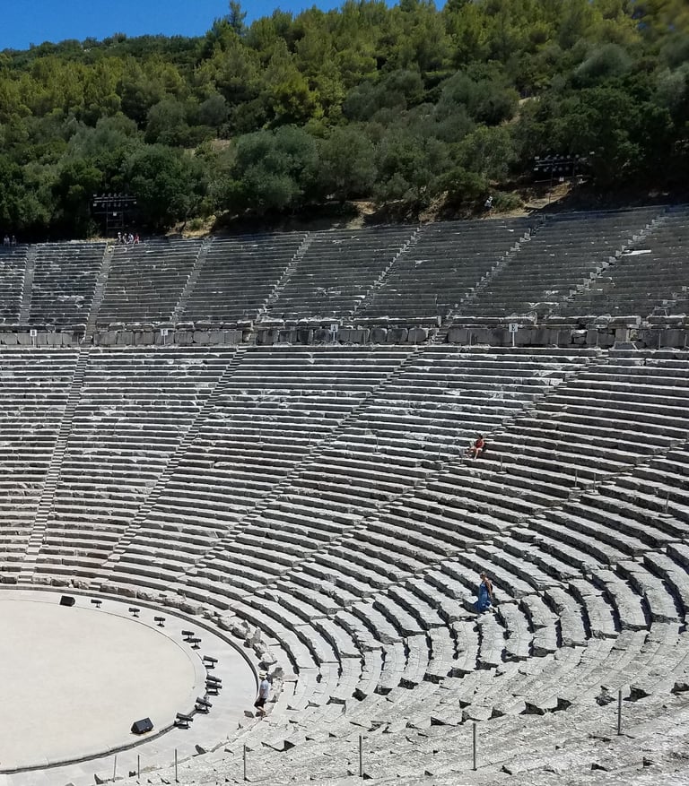 The restorative power of theatre is nothing new. In ancient Greece, amphitheatres were placed near sanctuaries for healing, like this acoustically perfect one in Epidavros. Beyond the stage is an expansive sanctuary dedicated to Asklepios, the god of medicine. It’s where pilgrims traveled to seek cures and comfort. It’s where evidence-based medicine began. Yes, right beside a theatre. Epidavros is a union of art and science, of surgery and plays.
