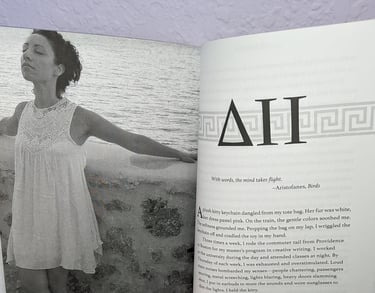During the design process, Demetra worked with Rebecca A. Demarest, an award-winning book designer. Early in the process, Rebecca researched how ancient Greeks categorized items. She discovered two ancient numbering systems to use within the memoir: Greek letters for the sections (similar to Roman numerals), and hashes for the chapters (similar to tally marks). Each chapter opened with photographs shot in Monemvasia, Greece, and epithets translated from ancient Greek plays.